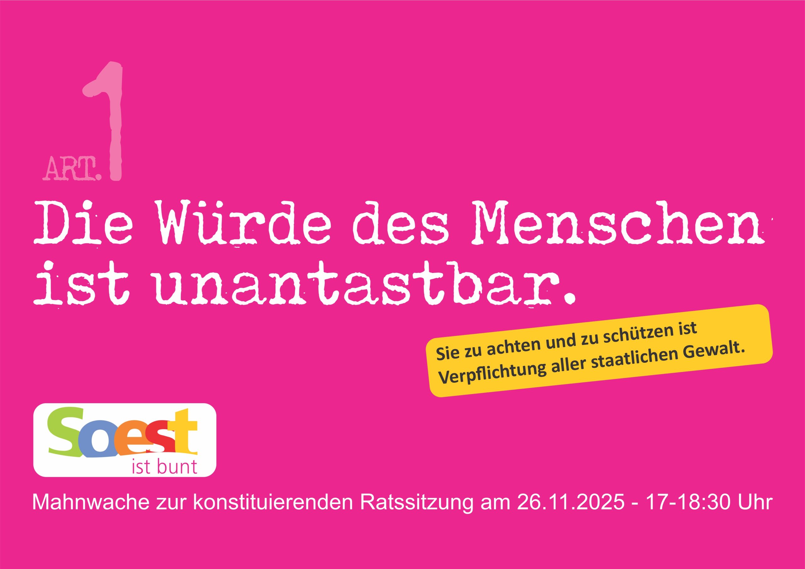 Am Dienstag, 26. November, ruft das Bündnis „Soest ist bunt!“ von 17:00 bis 18:30 Uhr zu einer Mahnwache unter den Arkaden des Soester Rathauses auf. Anlass ist die konstituierende Sitzung des neuen Stadtrates. Mit dieser Aktion möchten wir ein klares und sichtbares Zeichen setzen: Soest steht für Demokratie, Vielfalt und Integration.